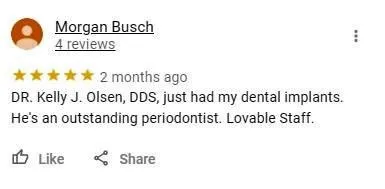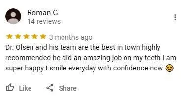 Dr Olsen & his staff are the so caring, kind & professional in all my dental needs--best I've ever experienced! Had an emergency & they worked me in & took care of it! I appreciated going that extra step! They genuinely care & make you feel well cared for in all they do!
